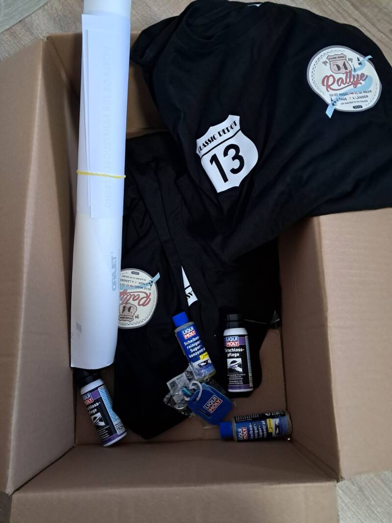 Am Samstag kam endlich das lang ersehnte Paket mit unserer Fahrzeugbeschriftung. Außerdem waren in dem Paket Team-Shirts mit unserer Startnummer 13, kleine Autopflegemittel, Aufkleber und ein Info-Schreiben.